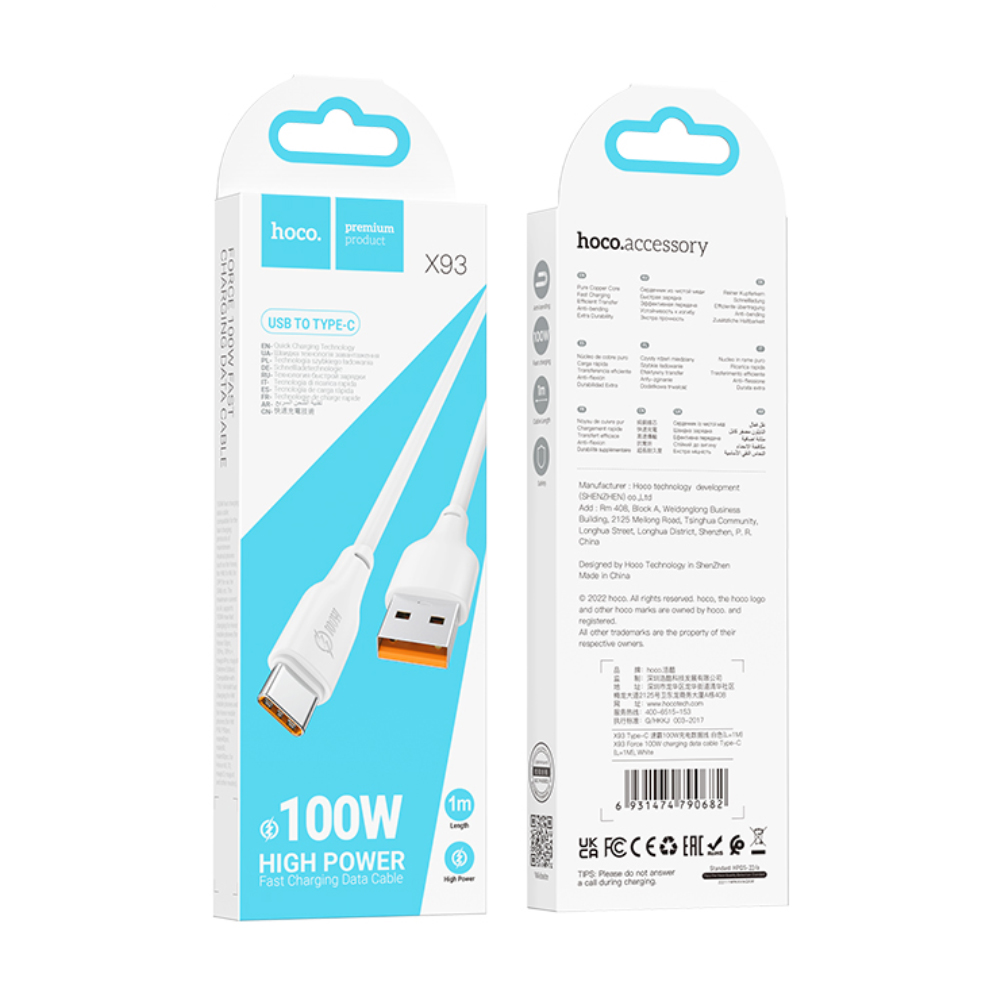 Καλώδιο Hoco X93 Force USB-A σε USB-C High Power 100W 6A Λευκό 1m