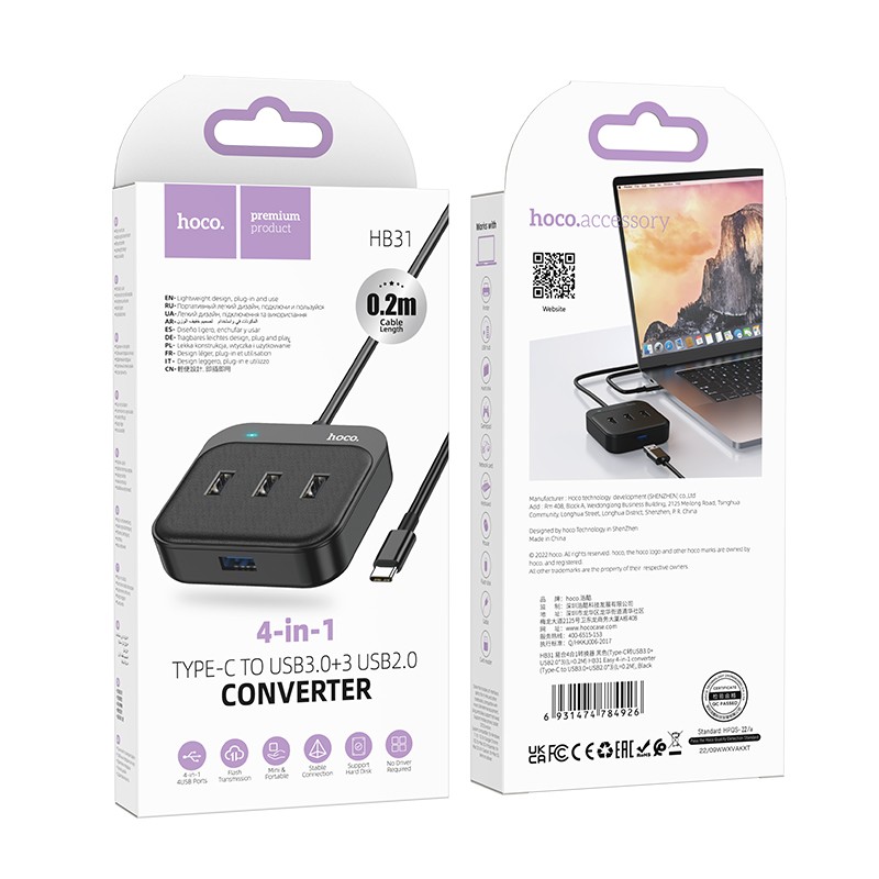 Hub USB-C Hoco HB31 Easy 4-in-1 με 1 x USB3.0 και 3 x USB2.0 Μαύρο 20cm