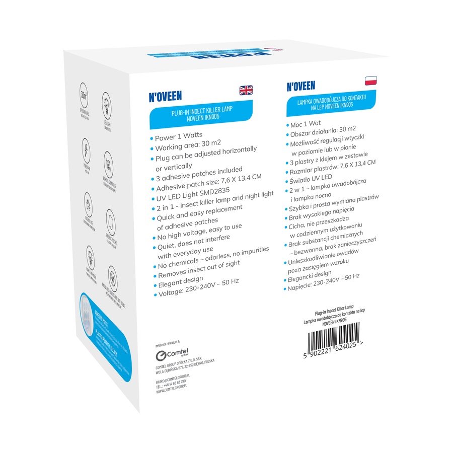 Ηλεκτρική Εντομοπαγίδα Πρίζας N'oveen IKN905 UV LED Ακτίνα 30m² και Φως Νυκτός