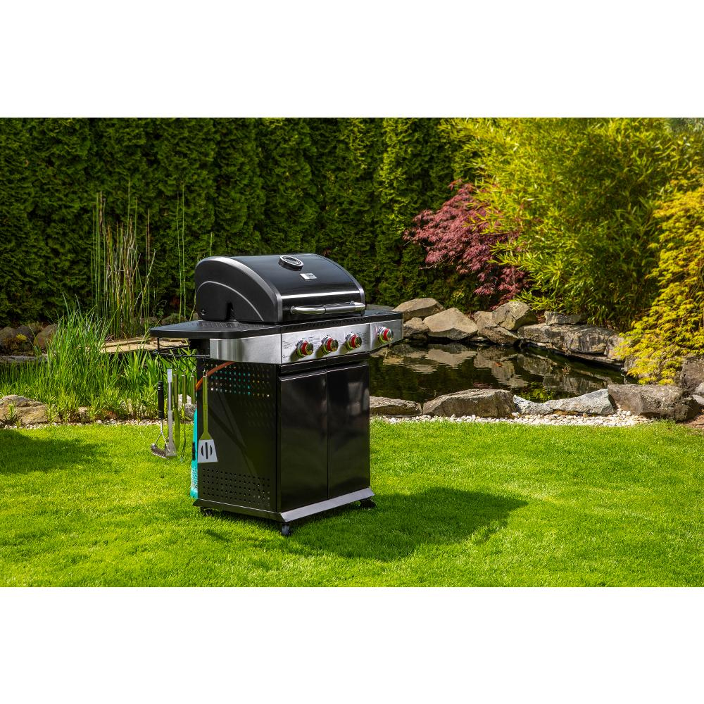 Ψησταρία υγραερίου FIELDMANN FZG 3013 με 3 κύριους καυστήρες και 1 πλευρικό καυστήρα συνολικής ισχύος 11.5kW, ενσωματωμένο σύστημα ανάφλεξης, επιφάνεια ψησίματος 60x42cm, ανοξείδωτο πάνελ ελέγχου και λαβές, σχάρα και πλάκα από μαντέμι, ενσωματωμένο θερμό