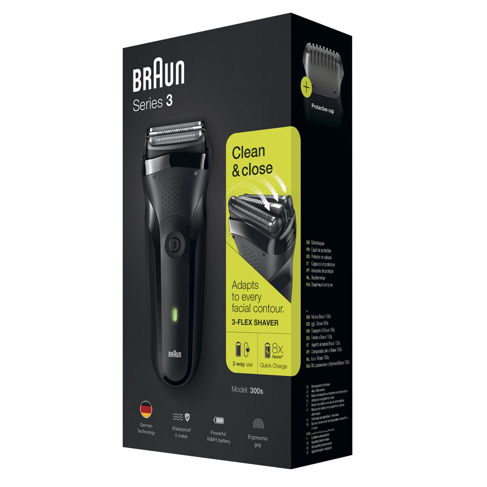 Η Braun 300s είναι μια επαναφορτιζόμενη ξυριστική μηχανή προσώπου, σχεδιασμένη για γρήγορο και αποτελεσματικό ξύρισμα. Διαθέτει σύστημα κοπής με δύο λεπίδες και πλέγμα SensoFoil για άνεση στο δέρμα. Η μπαταρία της προσφέρει έως και 20 λεπτά ασύρματης χρή