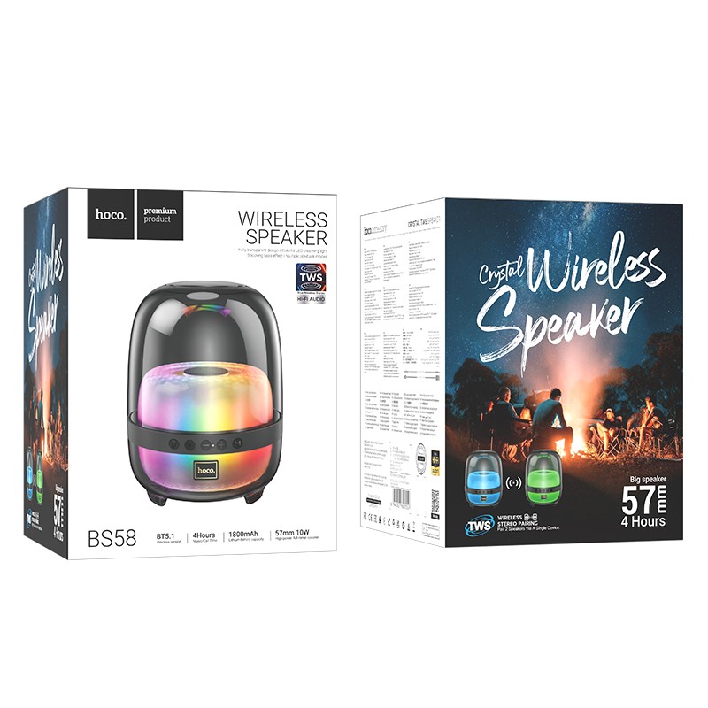 Το Hoco BS58 Crystal είναι ένα ασύρματο ηχείο με έξοδο 10W και μπαταρία 1800mAh μεγάλης διάρκειας. Διαθέτει Bluetooth 5.1 για σταθερή και αξιόπιστη σύνδεση, καθώς και θύρες USB, Micro SD και AUX για σύνδεση με άλλες συσκευές. Το ηχείο διαθέτει επίσης εφέ
