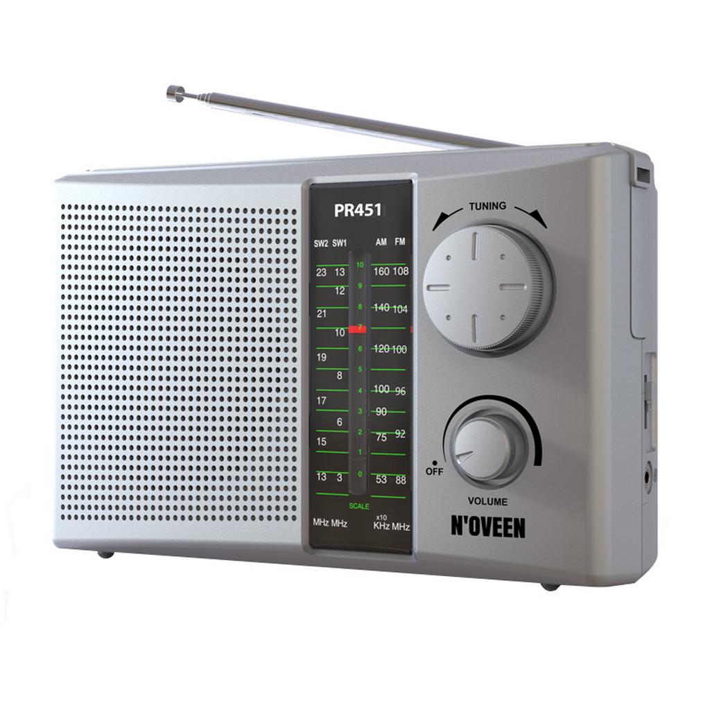 Φορητό Ραδιόφωνο N'oveen PR451 1W Ασημί με Τροφοδοσία Ρεύματος και Μπαταρίας. Διαθέτει λειτουργία ραδιοφώνου με υψηλή ευαισθησία δέκτη και ευανάγνωστη κλίμακα. Με 4 ραδιοφωνικές ζώνες και τηλεσκοπική κεραία. Ισχύς: 1W 220-240V 50Hz. Μπαταρίες: 2xR20 (δεν