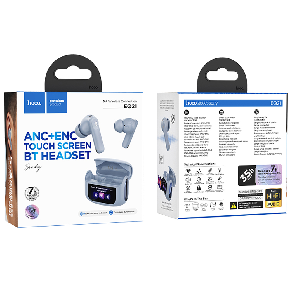 Τα Hoco EQ21 υποστηρίζουν λειτουργία ANC+ENC για μείωση θορύβου, δυνατότητα αλλαγής λειτουργιών με κίνηση (sliding tuning), εναλλαγή κύριου-δευτερεύοντος ακουστικού και ενεργοποίηση της Siri. Είναι εξοπλισμένα με έξυπνη LED οθόνη αφής στο κουτί φόρτισης,