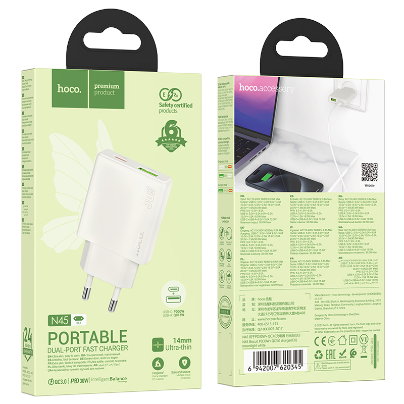 Το Hoco N45 Biscuit διαθέτει δύο θύρες USB, η καθεμία εξοπλισμένη με το δικό της αποκλειστικό πρωτόκολλο φόρτισης. Η θύρα USB-C υποστηρίζει παροχή ισχύος (PD) έως 30W, επιτρέποντας γρήγορη φόρτιση για συμβατά smartphone, tablet και φορητούς υπολογιστές.
