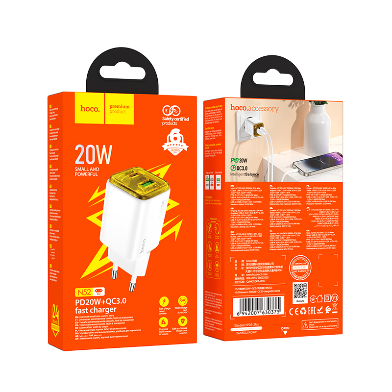 Ο Hoco N52 Monsoon είναι ένας ισχυρός φορτιστής ταξιδιού, κατασκευασμένος από επιβραδυντικό φλόγας υλικό, προσφέροντας μέγιστη ασφάλεια κατά τη χρήση. Διαθέτει δύο εξόδους, μια Type-C με ισχύ 20W και μια USB-A με ισχύ 20W. Όταν χρησιμοποιούνται ταυτόχρον