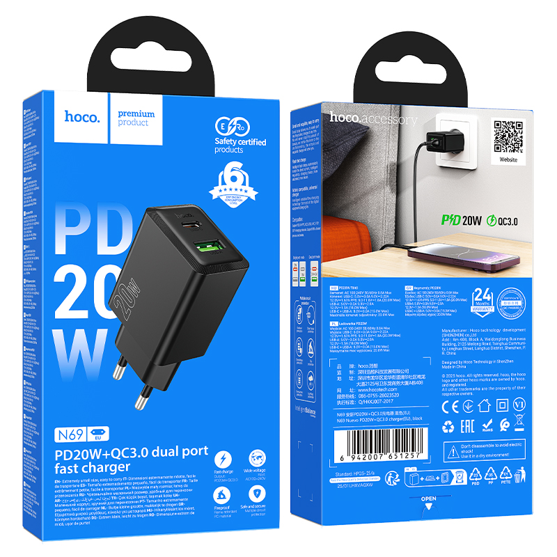 Φορτιστής Ταξιδίου Hoco N69 Nuevo PD20W QC3.0A 5V με 2 Εξόδους Φόρτισης 1xUSB-C και 1xUSB-A Μαύρος