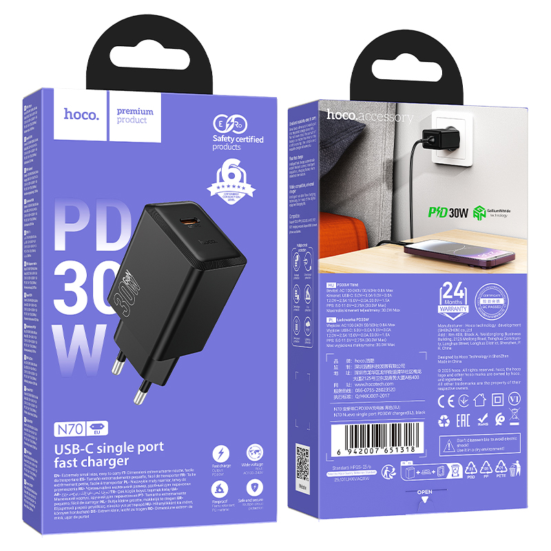 Φορτιστής Ταξιδίου Hoco N70 Nuevo με 1 Εξόδο Φόρτισης USB-C GaN PD30W 5V 3.0A Μαύρος