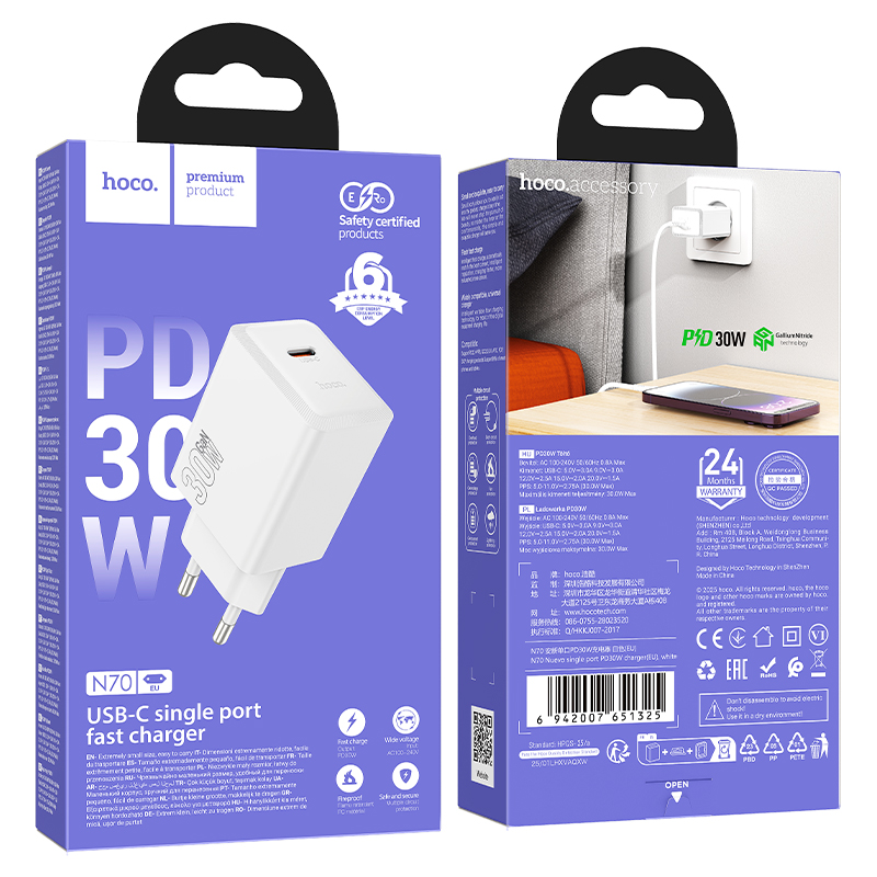 Φορτιστής Ταξιδίου Hoco N70 Nuevo με 1 Εξόδο Φόρτισης USB-C GaN PD30W 5V 3.0A Λευκός