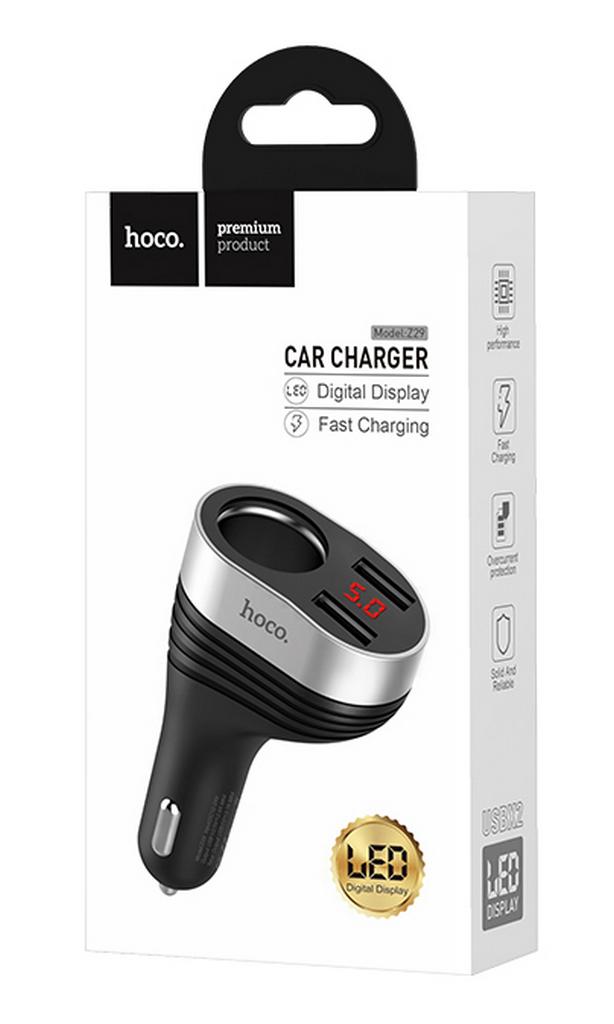 Φορτιστής Αυτοκινήτου Hoco Z29 Regal Dual USB Fast Charge 5V/3.1A με υποδοχή αναπτήρα Μαύρος και οθόνη με LED ένδειξη για τάση μπαταρίας αυτοκινήτου, τάση εξόδου και ρεύμα εξόδου. Input φορτιστή αυτοκινήτου: DC12-24V. Output: USB 1: DC5V / 2.4A, USB 2: D