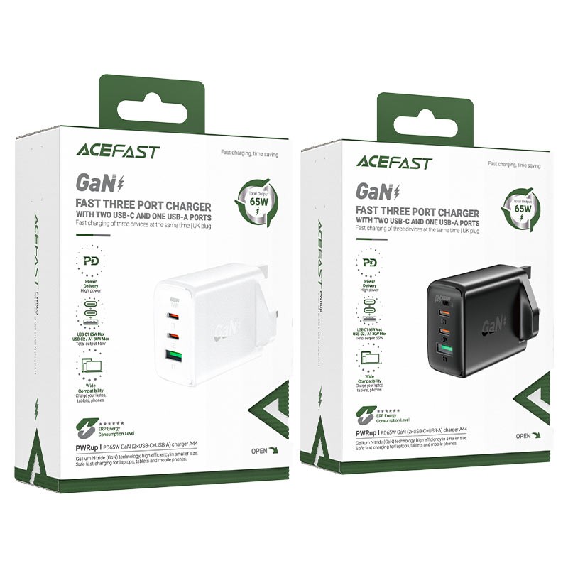 Φορτιστής Ταξιδίου Acefast A44 Fast Charging 2xUSB-C PD65W USB-A GaN με UK Plug. Υποστηρίζει PD65W, AFC, FCP και άλλα πρωτόκολλα φόρτισης. Με GaN για σταθερή φόρτιση, ταχύτερη ψύξη και μικρότερο μέγεθος. Συμβατός με το 99% ψηφιακών συσκευών φόρτισης USB.