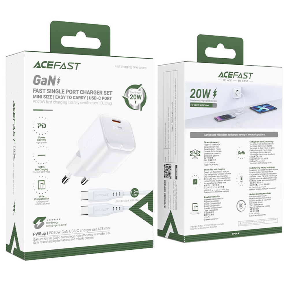 Φορτιστής Ταξιδίου Acefast A73 Mini Fast Charging 1xUSB-C PD20W QC3.0 GaN Λευκός + Καλώδιο USB-C σε USB-C