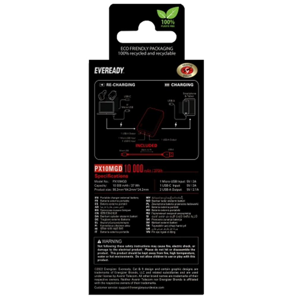 Power Bank Energizer Eveready Mini 10000mAh 2.1A με 2x USB 2.0 και LED Ένδειξη Μπαταρίας. Χωρητικότητα: 10000mAh.A+ Class Li-Polymer μπαταρία. Είσοδος Micro & USB-C 5V 2A. Έξοδος 2 USB-A 5V 2A. Υλικό: Πλαστικό. Συμπεριλαμβάνεται: Καλώδιο Φόρτισης Micro-U