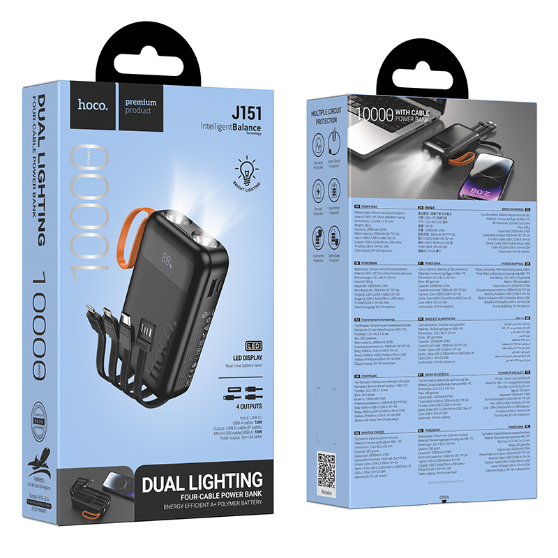 Power Bank Hoco J151 Spirit 10000mAh με 4 Καλώδια Φόρτισης, Φακό και LED Ένδειξη Μαύρο