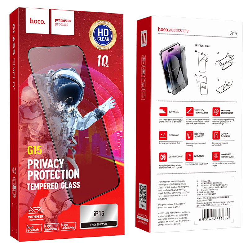 Tempered Glass Hoco Premium Series G15 0.33mm 30 Μοίρες Privacy Angle για Apple iPhone 15/16 Σετ 10τ