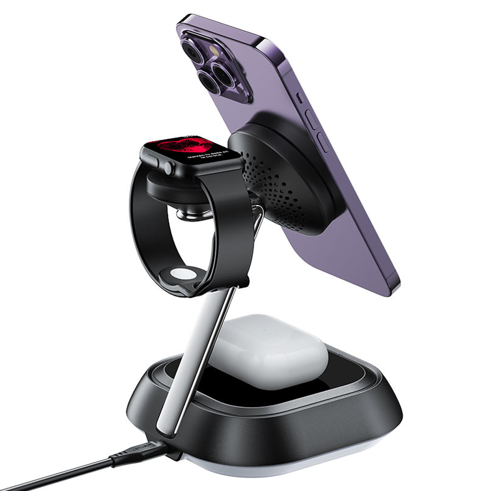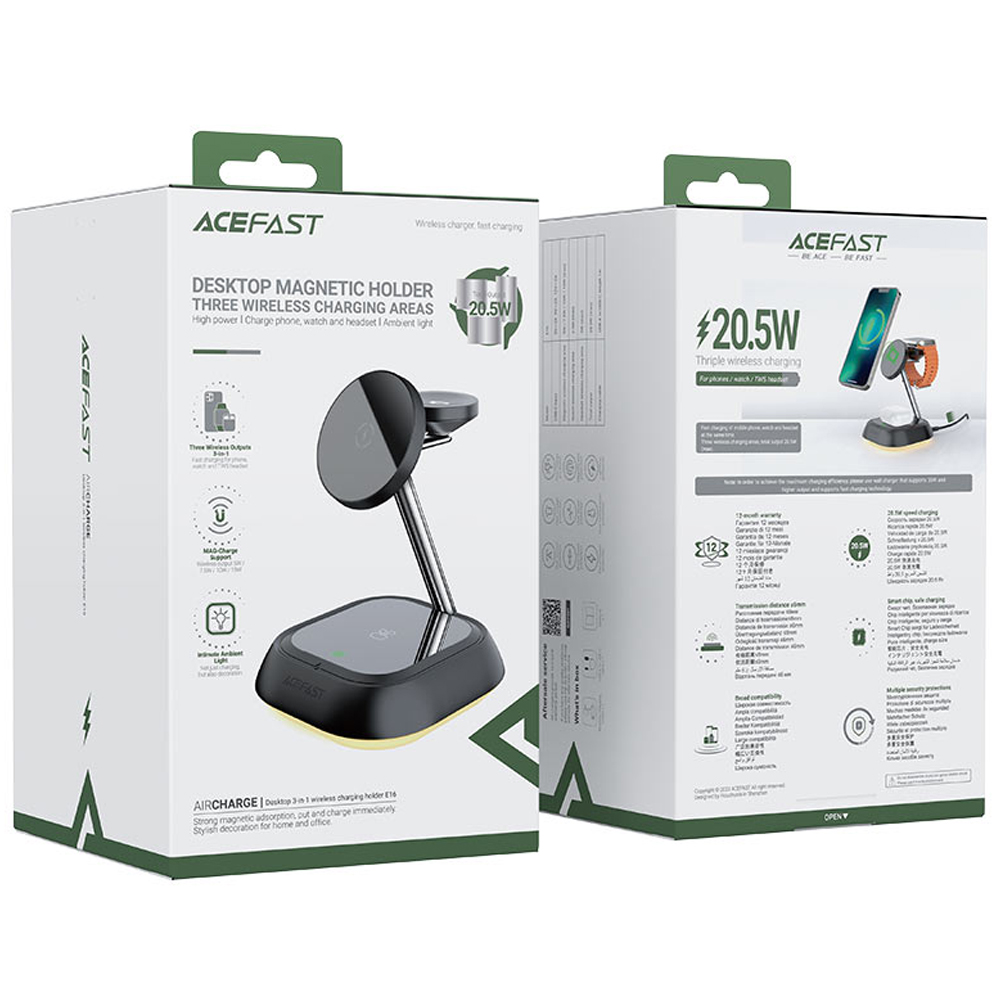 Η επιτραπέζια βάση Fast Wireless Charger Desktop Holder E16 είναι μαγνητικός ασύρματος φορτιστής για κινητό τηλέφωνο, ασύρματα ακουστικά (TWS) και έξυπνο ρολόι, με LED φωτισμό ατμόσφαιρας, υποστηρίζει μέγιστη ισχύ 20.5W και προσφέρει 3 σε 1 ασύρματη φόρτ
