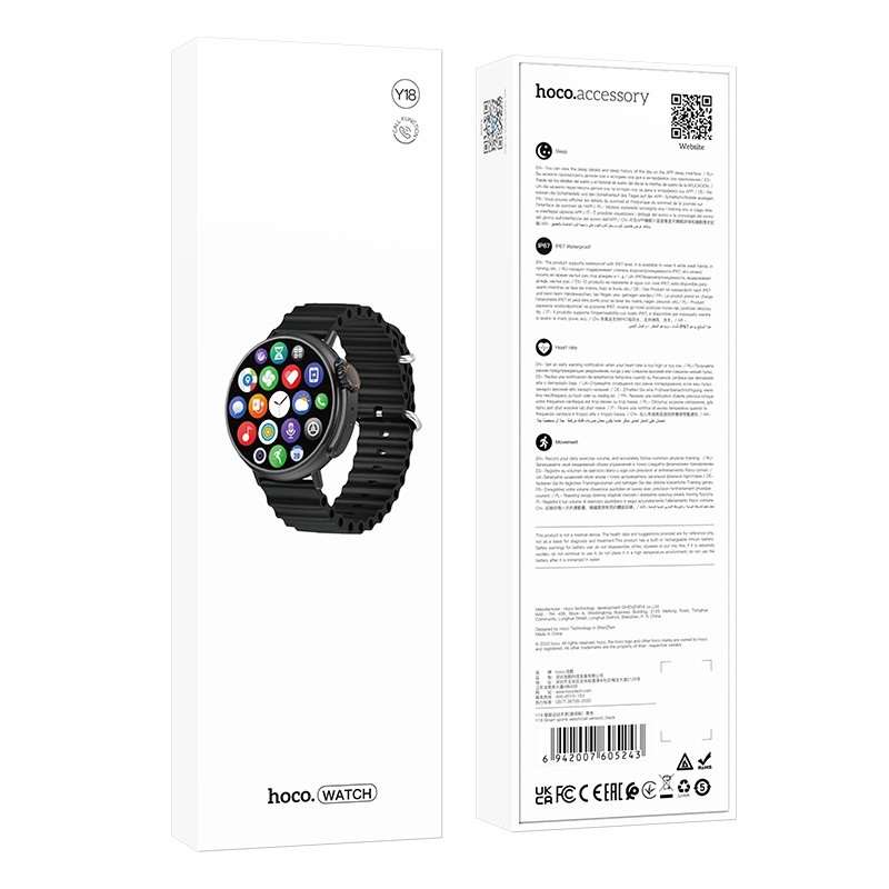 Smartwatch Hoco Y18 με μεγάλη οθόνη και πολλές λειτουργίες, συμπεριλαμβανομένου αισθητήρα καρδιακού παλμού, πολλαπλών αθλητικών λειτουργιών κα, ενώ υποστηρίζει τηλεφωνικές κλήσεις μέσω Bluetooth. Εξοπλισμένο με οθόνη αφής IPS 1,52 ιντσών και ανάλυση 360x